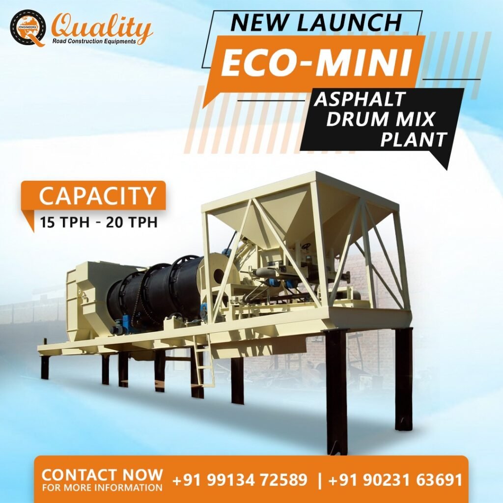 Eco-Mini Asphalt Drum Mix Plant is engineered for small to medium-scale road construction projects with a production capacity of 15–20 TPH, delivering consistent and high-quality hot mix asphalt. Its compact and mobile design makes it easy to transport, install, and operate at different project sites with minimal foundation work. The plant is equipped with an efficient drying and mixing system that ensures uniform heating and proper bitumen coating, resulting in superior asphalt output.